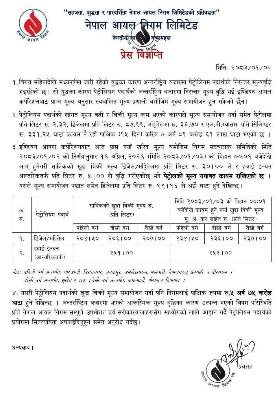 नेपाल आयल निगमले आज राती १२ बजेबाट लागू हुनेगरी डिजेल र मट्टीतेलको मूल्य ३० रुपैयाँले बढाएकाे छ । पेट्रोलको मूल्य भने बढेकाे छैन ।